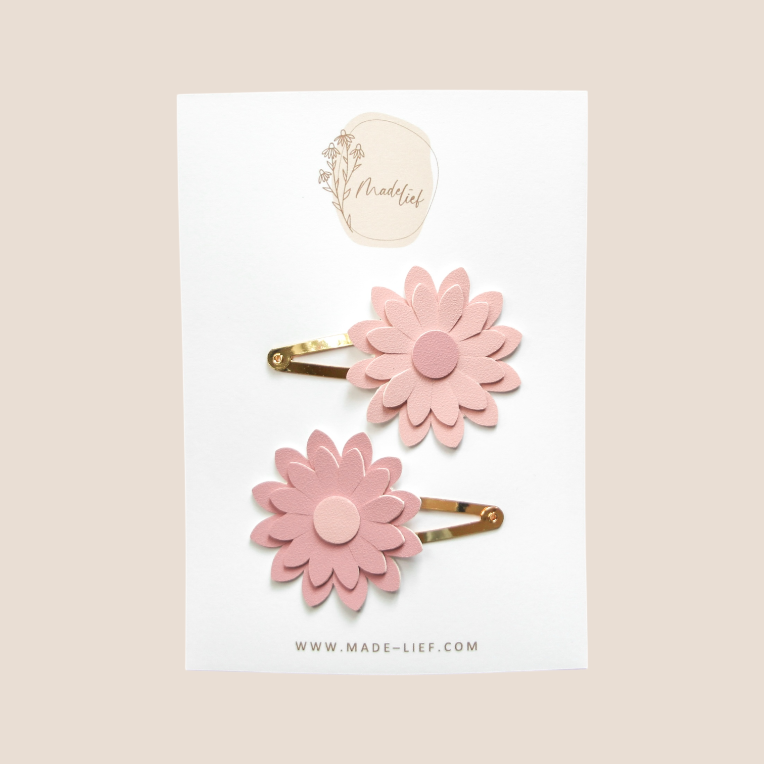 Kunstwerkjes, dat zijn deze Flowerly clips. Een echte eyecatcher in de haren van je mini. De bloemen zijn opgebouwd uit twee lagen hoogwaardig kunstleer met een  kern om het geheel compleet te maken. De doorsnede van de grootste buitenste bloem is 4,5 cm.