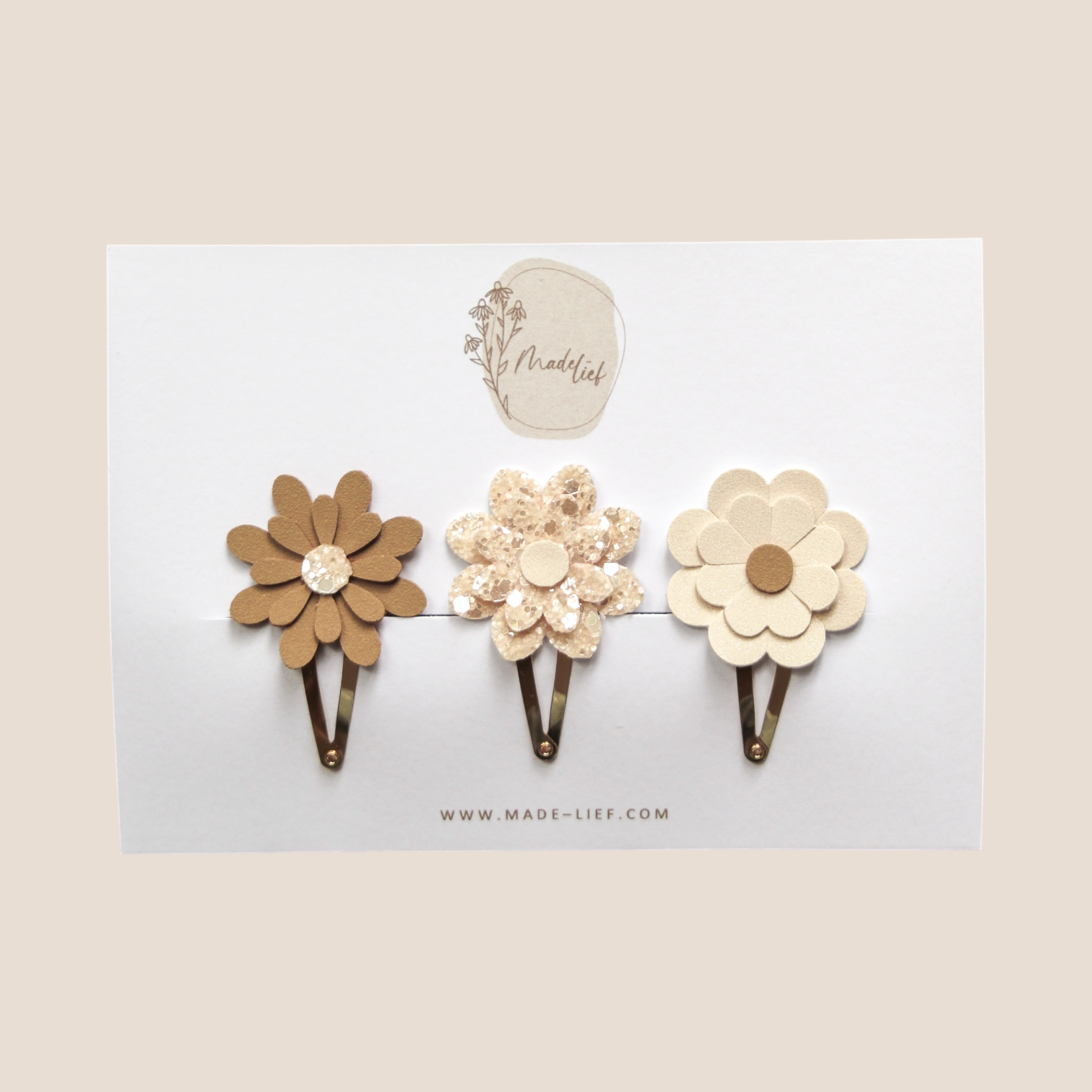 Musthave! Deze prachtige bloemen sets. Elke bloem is super leuk te combineren maar ook los van elkaar zijn ze leuk om te dragen. Het leukste van deze bloemen is dat ze op elke maat clip bevestigd kunnen worden. Geef dus vooral je voorkeur voor een 3, 4 of 5 cm clip of een alligator speldje aan. Daarnaast kun je ook de kleur van de gewenste klikklak aangeven in het keuzemenu. Geef je niks aan dan worden de bloemen bevestigd op een gouden clip. De doorsnee van de bloem is 35 mm.