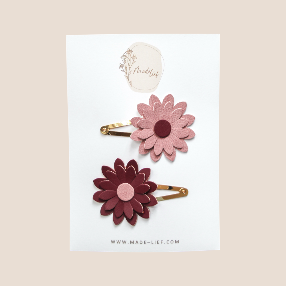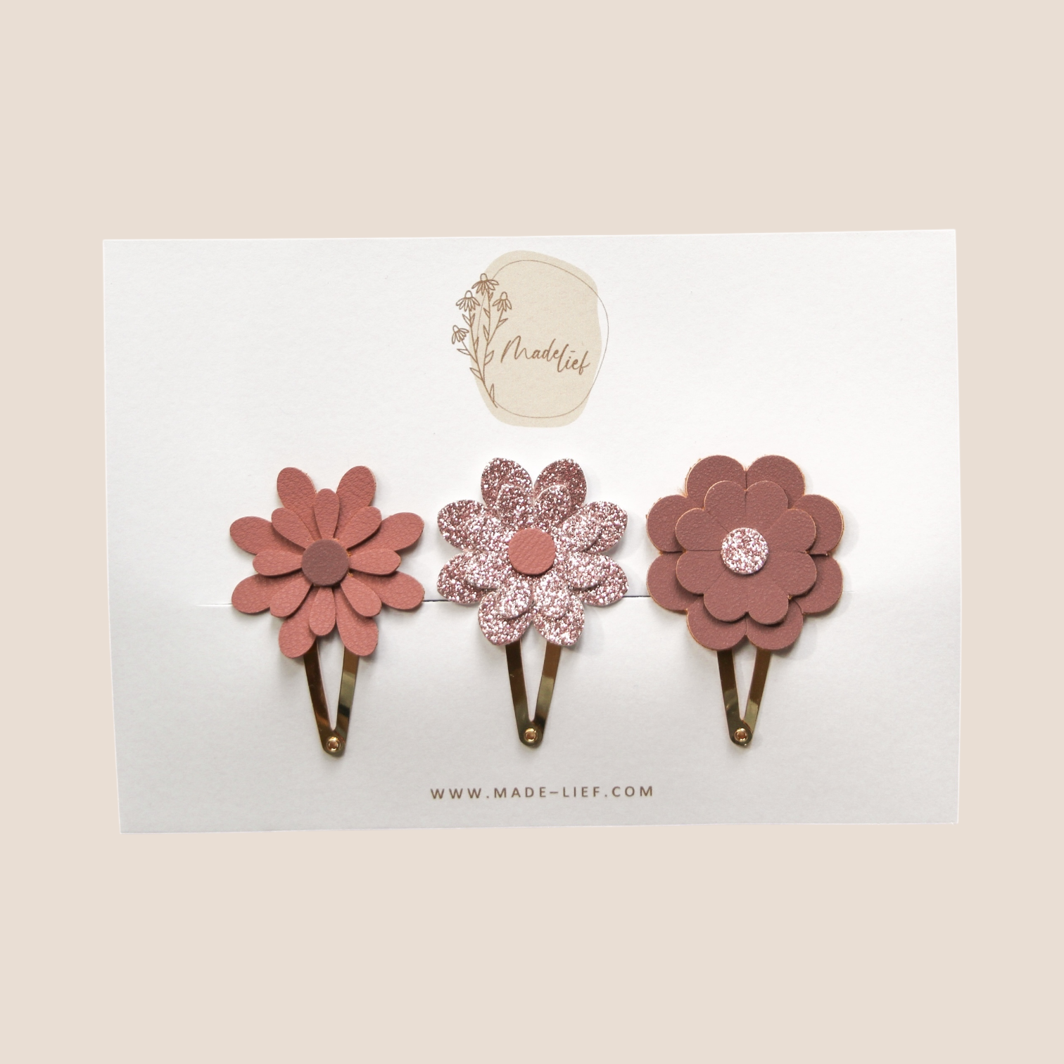 Musthave! Deze prachtige bloemen sets. Elke bloem is super leuk te combineren maar ook los van elkaar zijn ze leuk om te dragen. Het leukste van deze bloemen is dat ze op elke maat clip bevestigd kunnen worden. Geef dus vooral je voorkeur voor een 3, 4 of 5 cm clip of een alligator speldje aan. Daarnaast kun je ook de kleur van de gewenste klikklak aangeven in het keuzemenu. Geef je niks aan dan worden de bloemen bevestigd op een gouden clip. De doorsnee van de bloem is 35 mm.