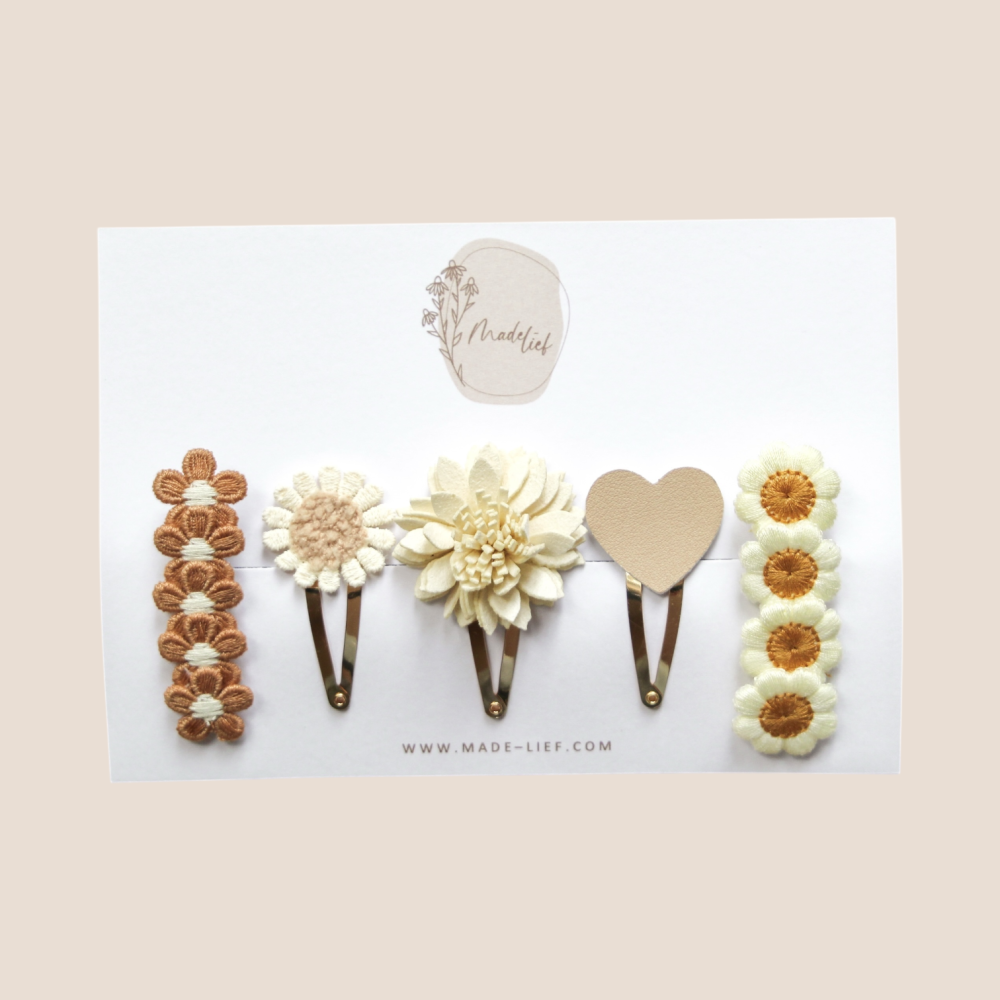 De set is bevestigd op donkerbruine elastiekjes. Een set bestaat uit twee stuks.