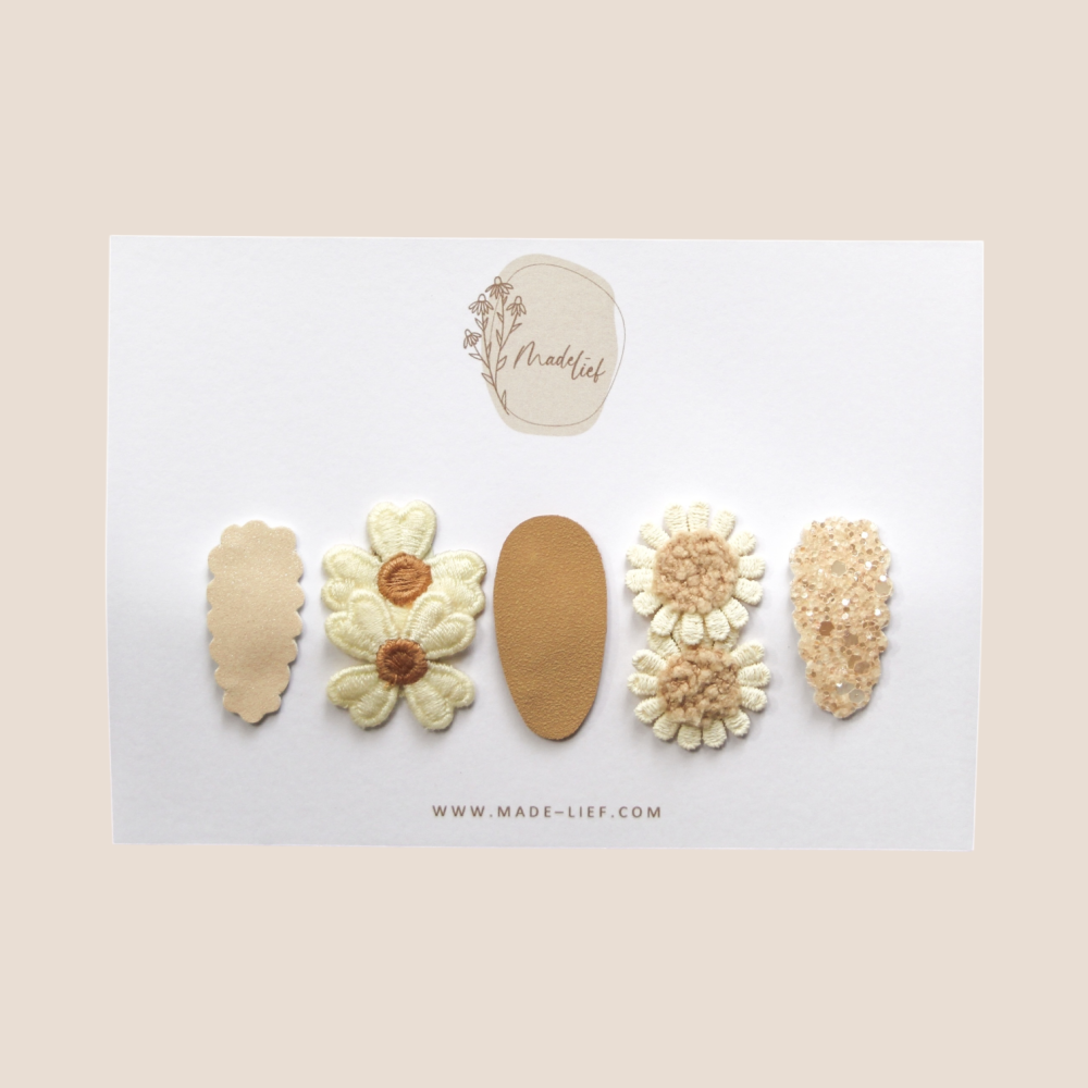 De set is bevestigd op beige elastiekjes. Een set bestaat uit twee stuks.