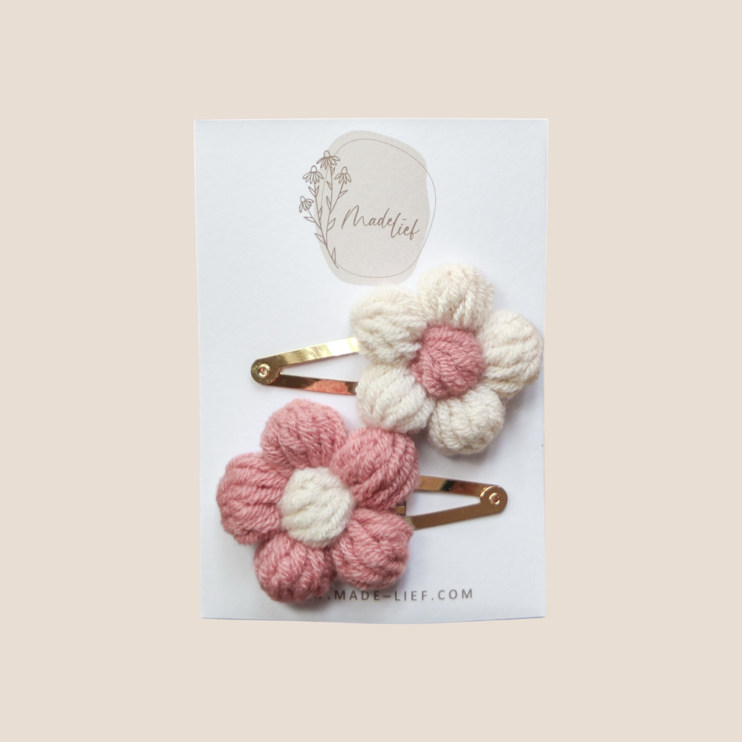 De bloemen kunnen bevestigd worden op een antislip, klikklak of alligator speldje, tevens kun je de gewenste kleur voor een klikklak aangeven in het keuzemenu. Bij de keuze voor een antislip of alligator speldje worden deze onzichtbaar onder de bloem bevestigd.