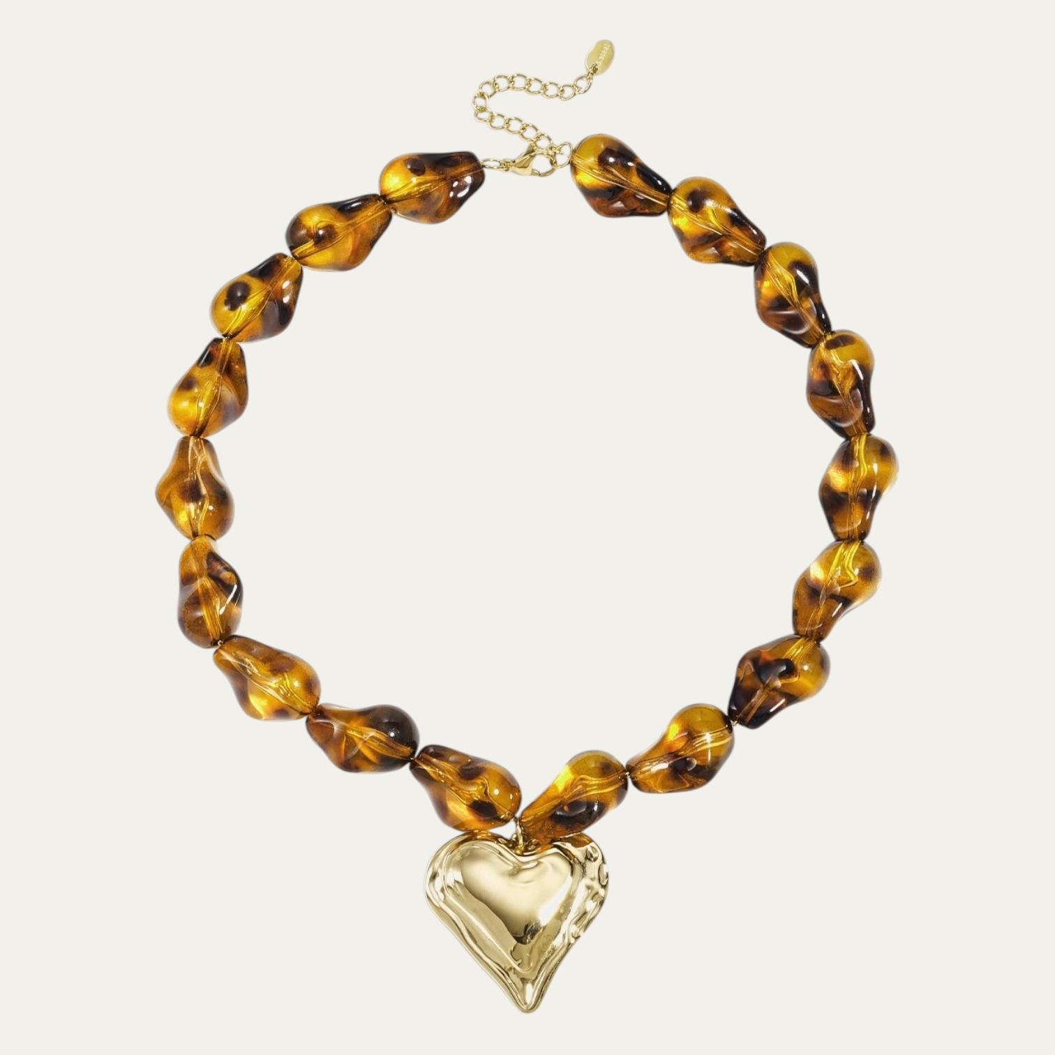 Deze statement ketting met organische kralen is de finishing touch voor je outfit. Deze opvallende ketting combineert warme, amberkleurige kralen en een hartbedel als eyecatcher. De onregelmatige vormen geven de ketting een unieke, natuurlijke uitstraling.