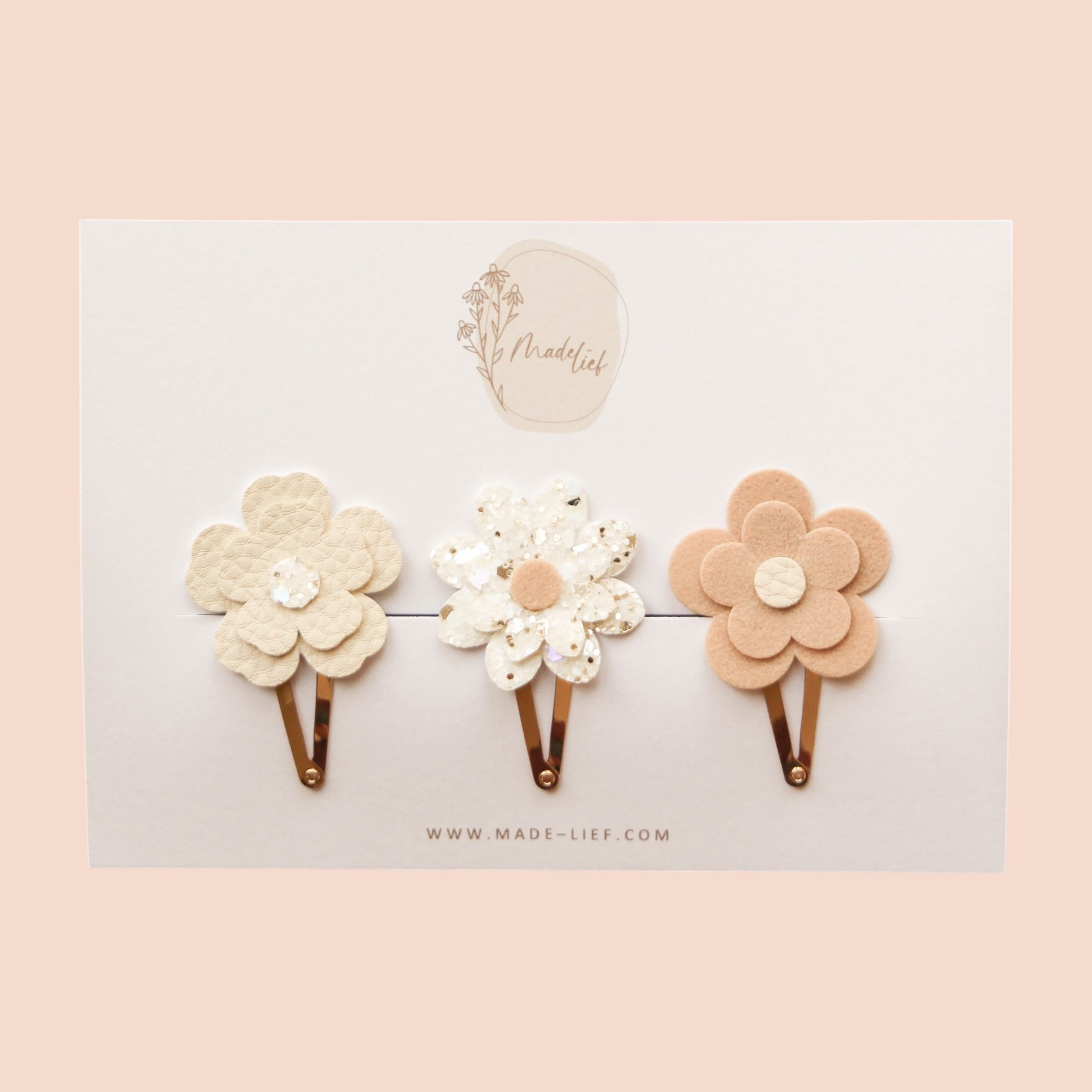 Musthave! Deze prachtige bloemen sets. Elke bloem is super leuk te combineren maar ook los van elkaar zijn ze leuk om te dragen. Het leukste van deze bloemen is dat ze op elke maat clip bevestigd kunnen worden. Geef dus vooral je voorkeur voor een 3, 4 of 5 cm clip of een alligator speldje aan. Daarnaast kun je ook de kleur van de gewenste klikklak aangeven in het keuzemenu. Geef je niks aan dan worden de bloemen bevestigd op een gouden clip. De doorsnee van de bloem is 35 mm.