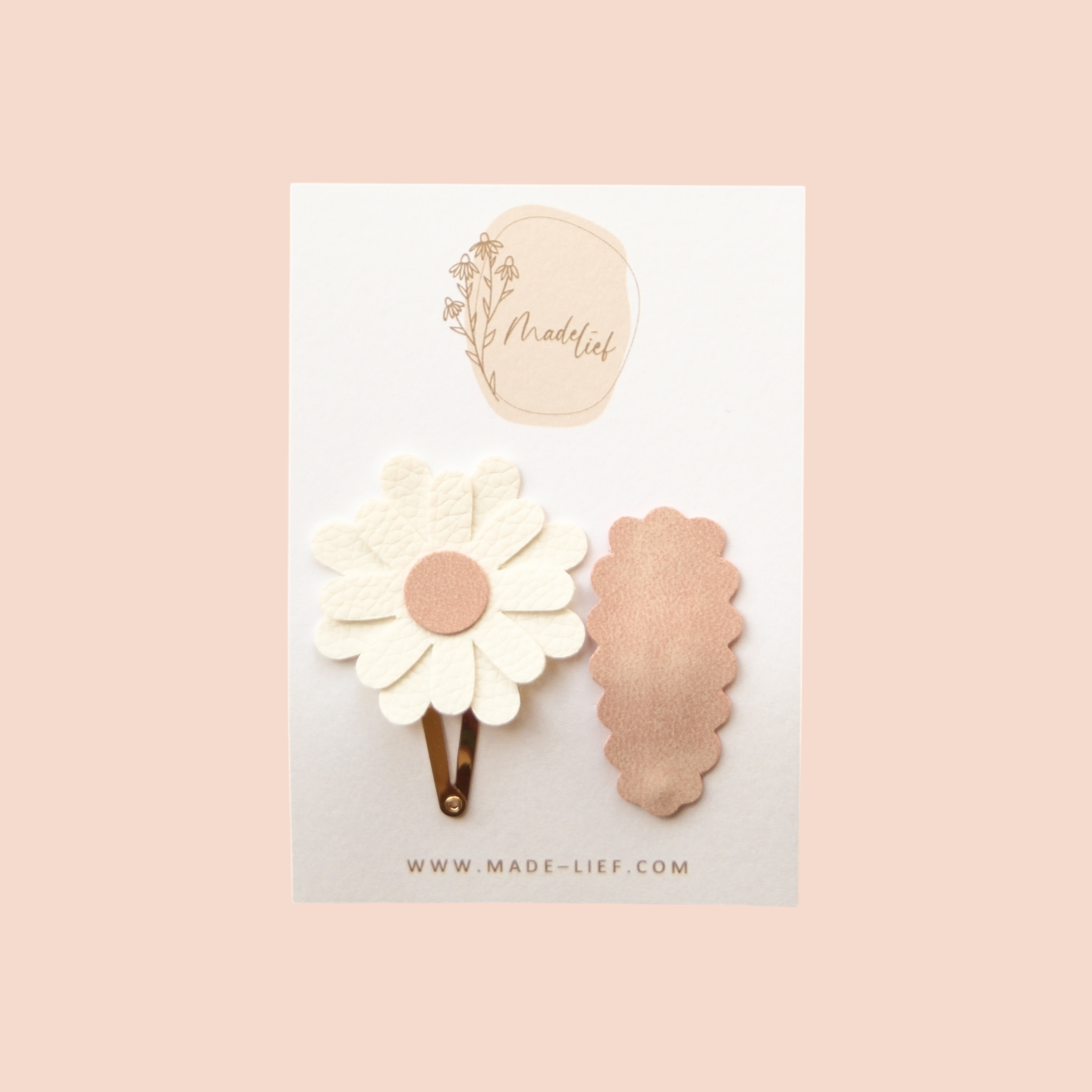 Hoe schattig is dit setje met de madelief bloem en bijpassende Charlie clip… Je kunt dit setje zelf samenstellen in maat naar keuze. Wil je de madelief bloem op een alligator speldje (3,5 cm) geef dit dan even aan in de opmerking bij je bestelling. Het Charlie speldje wordt altijd op een klikklak of antislip speldje bevestigd.