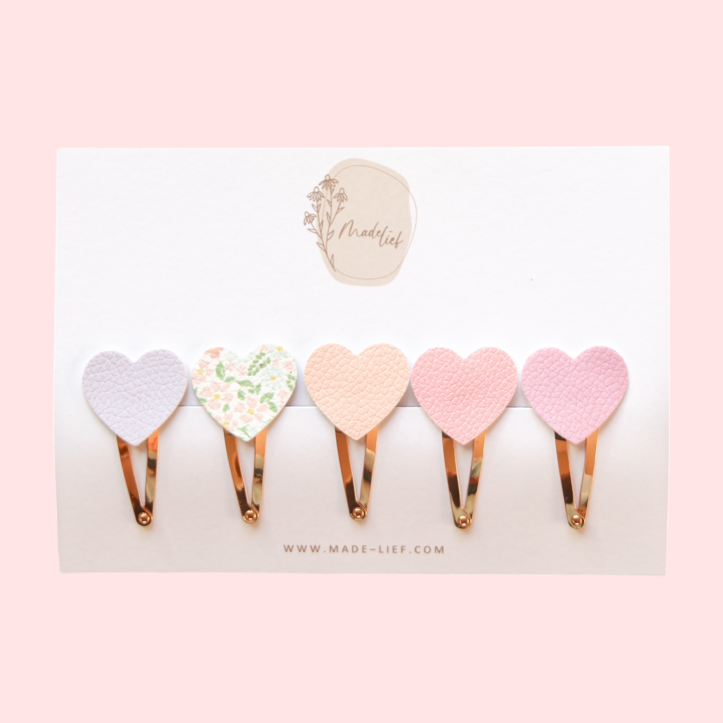 Deze lieve hartjes set is de perfecte basic om elk kapsel op te fleuren. De hartjes kunnen bevestigd worden op drie maten klikklaks in kleur naar keuze. De set bestaat uit vijf kleuren hartjes zoals afgebeeld.