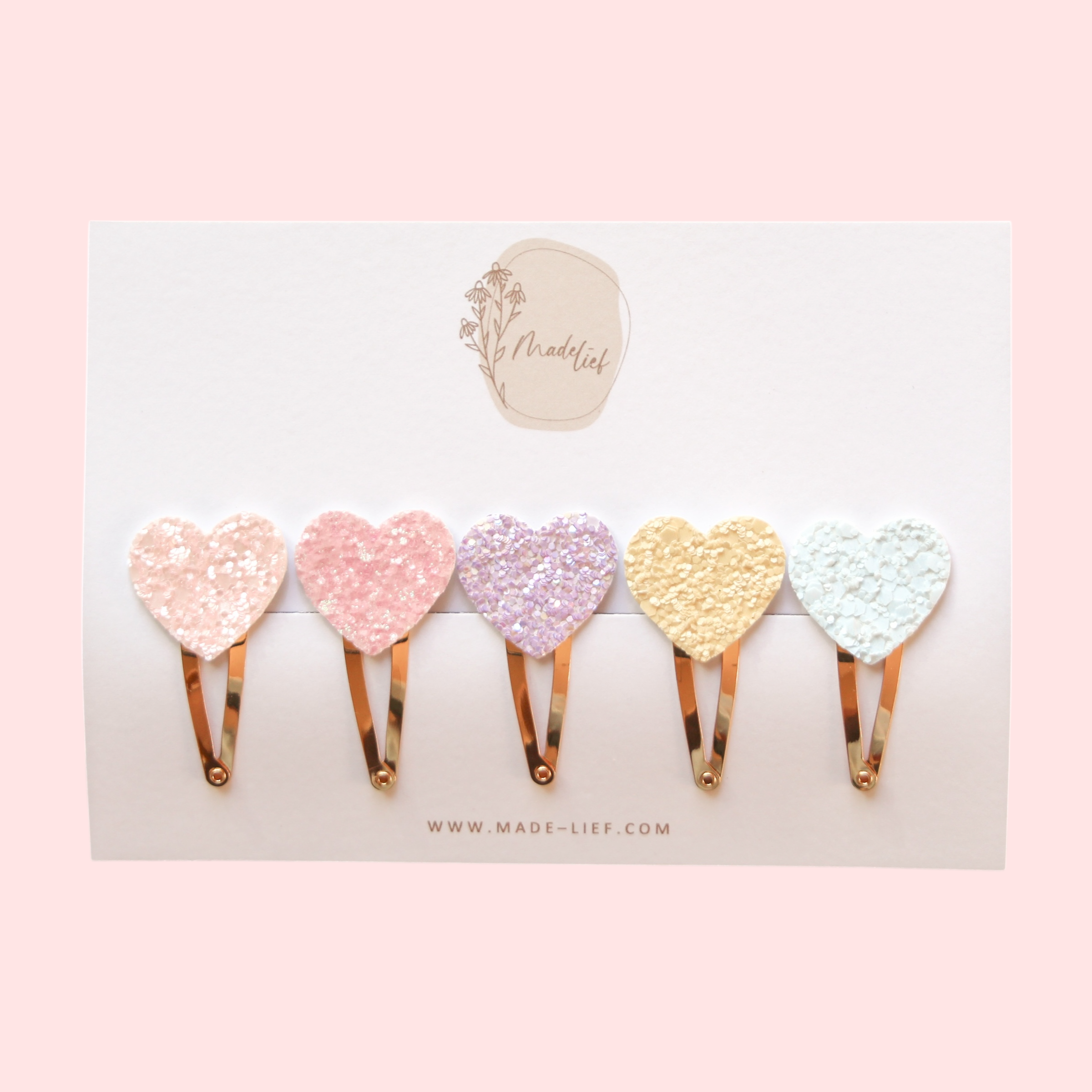 Deze lieve hartjes set is de perfecte basic om elk kapsel op te fleuren. De hartjes kunnen bevestigd worden op drie maten klikklaks in kleur naar keuze. De set bestaat uit vijf kleuren hartjes zoals afgebeeld.