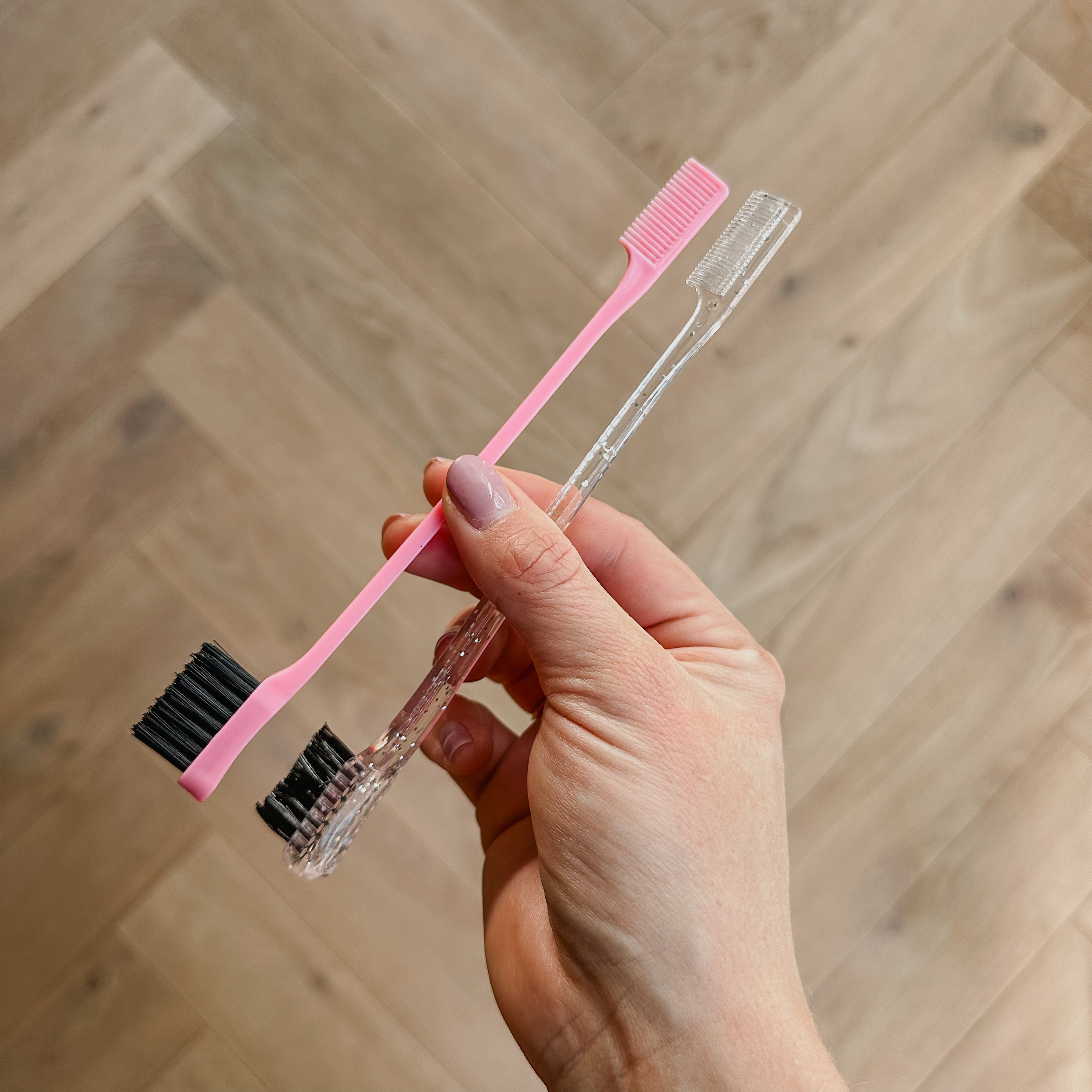 Deze praktische dubbelzijdige vlechtentool is perfect voor het stylen en strak invlechten van het haar. De borstelzijde met stevige zwarte haartjes is ideaal om haartjes glad te strijken en strakke lijnen te creëren. De kamzijde helpt bij het nauwkeurig scheiden van het haar en het netjes afwerken van de vlecht. Onmisbaar voor elke vlechtliefhebber!